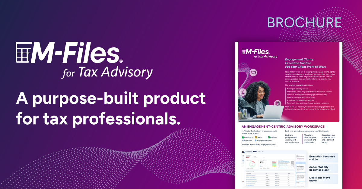 Scientific Research M-Files for Tax Advisory: Engagement-Centric Workflow M‑Files for Contracts: AI Contract Lifecycle Management M‑Files for Quality: Audit‑Ready Quality Management Solution Context-First Document Management Guide Microsoft 365 Copilot Governance with M-Files AI Advantage Context-First Document Management Architected for AI: A Strategic Guide to Modern Document Management Build a Stronger Business with Risk and Compliance Management eBook: Technology Record Issue 38 2025 QMS Buyer’s Guide | Choose Quality Management Software The Stroke Association Trelleborg Sealing Solutions Kalmar AB Quality Management: Boost Operational Performance through Quality Management Local Health Authorities Analytical Committee (LHAAC) Enterprise Asset Management: Empowering Organizations with Enterprise Asset Management Why Knowledge Work Automation Unlocks Manufacturing Excellence Navigating Security and Compliance Obstacles with M-Files Solving Information Chaos with AI – See M-Files Featured in Technology Record PHOENIX Group Customer Spotlight: Driving Global Quality Transformation at PHOENIX Group with M-Files Hafslund Celsio Enabling Knowledge Workers with AI White paper: Unlocking the Power of Generative AI with Microsoft 365 Enabling Knowledge Workers with AI Elomatic Using Knowledge as a Competitive Advantage: Capturing and Leveraging Intellectual Capital Unlocking the value of Knowledge Work Automation